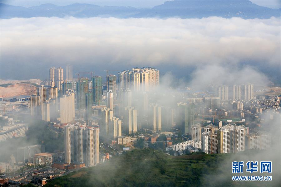 这是8月21日在贵州省凯里市小高山拍摄的平流雾景观。当日清晨,贵州省凯里市出现平流雾景观,城市建筑在雾中若隐若现,宛若仙境。 新华社发(吴吉斌 摄)