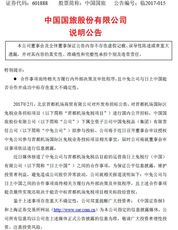 3月23日早间,中国国旅股份有限公司(以下简称“中国国旅”)发布公告称,近日媒体报道的其下属全资子公司中国免税品(集团)有限责任公司与日上免税行(中国)有限公司之间的合作事宜尚待相关方履行内外部决策及审批程序,且上述合作事宜能否最终实现,还取决于能否中标首都机场免税项目相关标段的经营权。