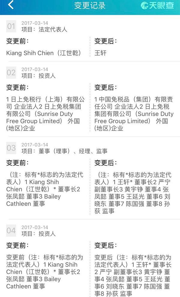 发生变更的是日上免税行(中国)有限公司,简称“日上中国”。根据最新的工商信息变更信息,中免公司已参股日上中国,持股比例为51%,信息变更时间为3月14日。同一天,日上中国的法定代表人和董事长也由江世乾变更为中免集团党委书记王轩,中免集团总经理陈国强出任日上中国的董事。