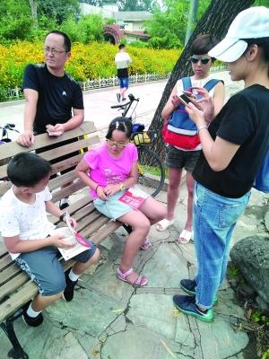 图中黑衣服白帽子的女孩,自称是“学生导游”,匆匆带着游览完毕后,兜售《学习方法》小册子,家长纷纷掏钱。