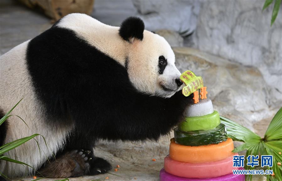 8月18日,大熊猫舜舜在享用“生日蛋糕”。 当日,大熊猫贡贡和舜舜在海南热带野生动植物园迎来6周岁的“生日派对”。大熊猫贡贡和舜舜来自四川中国大熊猫保护研究中心,2018年11月10日来到海南省海口市。 新华社记者 郭程 摄