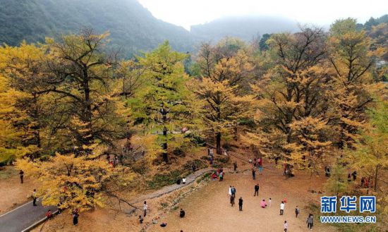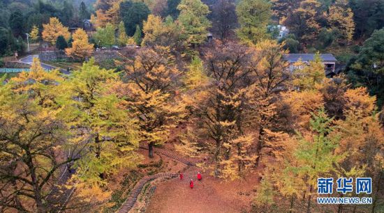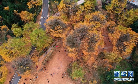 11月21日,游客在桐子坳村银杏林游览(无人机照片)。